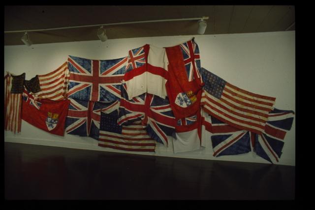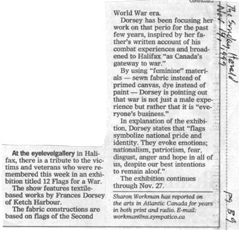 "Eyelevel Gallery is pleased to present 12 Flags for a War, an exhibition of textile-based work by artist Frances Dorsey (Ketch Harbour, NS). On display is a series of fabric contructions based on World War II era flags and related subject manner. The artist states, "For the past few years my work has been based on the Second World War. Initially this came from my father's written account of his experience in combat. With time it has evolved into an investigation of North American WWII experience, with an increasing focus on Halifax as Canada's gateway to war." The symbolic and metaphoric connotations which exist within the flag as an object, are explored within this personalized area of focus and through the sculptural examples that result. Dorsey continues, "Flags symbolize national pride and identity. They evoke emotions; nationalism, patriotism, fear, disgust, anger and hope in all of us, despite our best intentions to remain aloof."