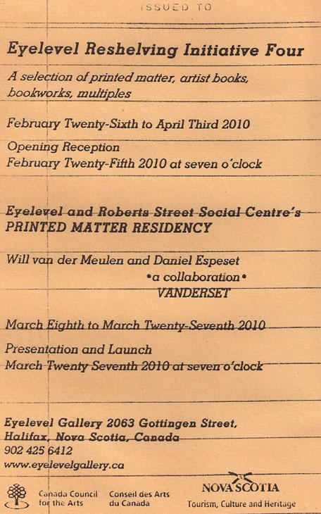 The Eyelevel Re-shelving Initiative is an international biennial exhibition of artist books, multiples, and printed matter, refreshing Eyelevel Gallery’s Bookstore collection with works from close to 80 established and emerging artists. This fourth installment offers a chance to peruse and purchase new and unusual works from: Red Fox Press (Ireland), Perro Verlag (Mayne Island, BC), Instant Coffee (Toronto), Islands Fold (Victoria), Valerie Salez (Halifax), Anteism Publishing (Victoria), Garity Chapman (Halifax), Andrew McLaren (Halifax), Adam O’Reilly (Halifax), T.R. Ericsson (New York), Stacy Ho (Toronto), and Dustin Wilson (Montreal) and many more.