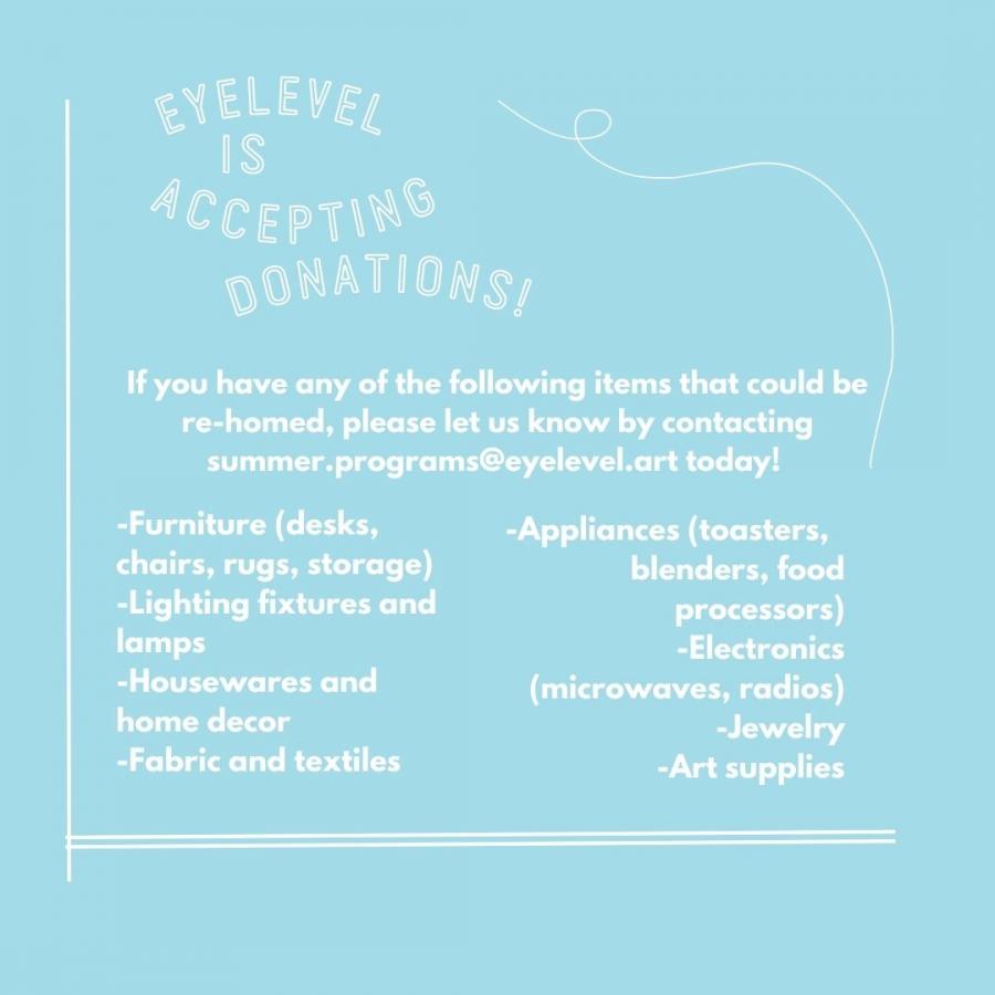 Eyelevel Gallery is looking for your old furniture, artwork, fabric, electronics, appliances, lighting fixtures, trinkets, instruments, and second-hand clothing for an upcoming fundraising event! Feel free to email Francella at summer.programs@eyelevel.art for more information or to arrange drop-off / pick-up depending on your needs!