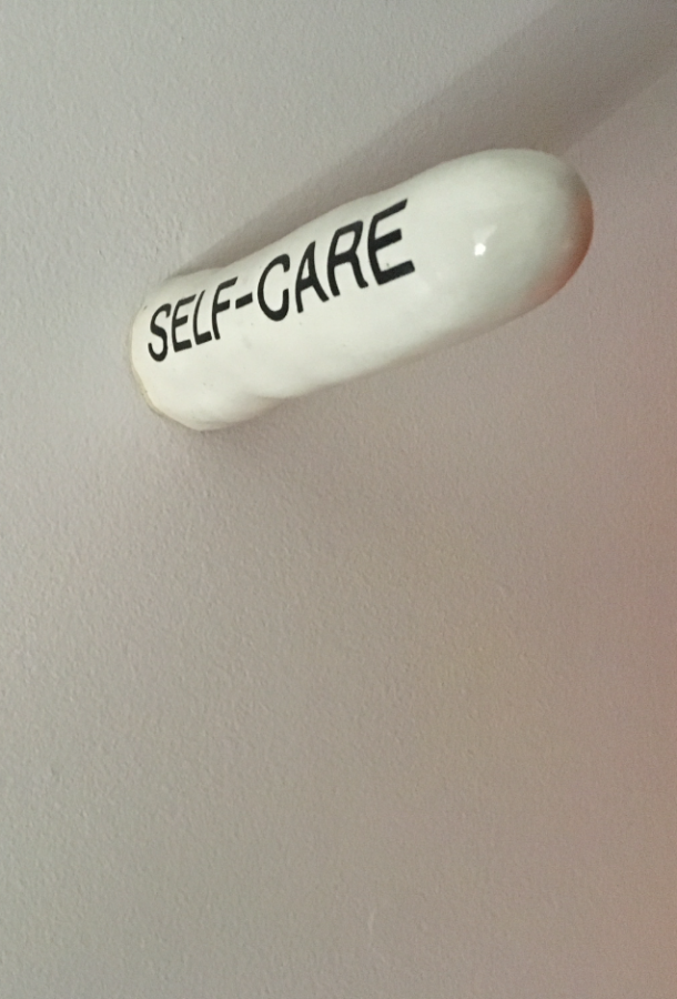 [image description: a white phallic shaped sculpture with "self-care" in black block letters protrudes from the top of a wall]