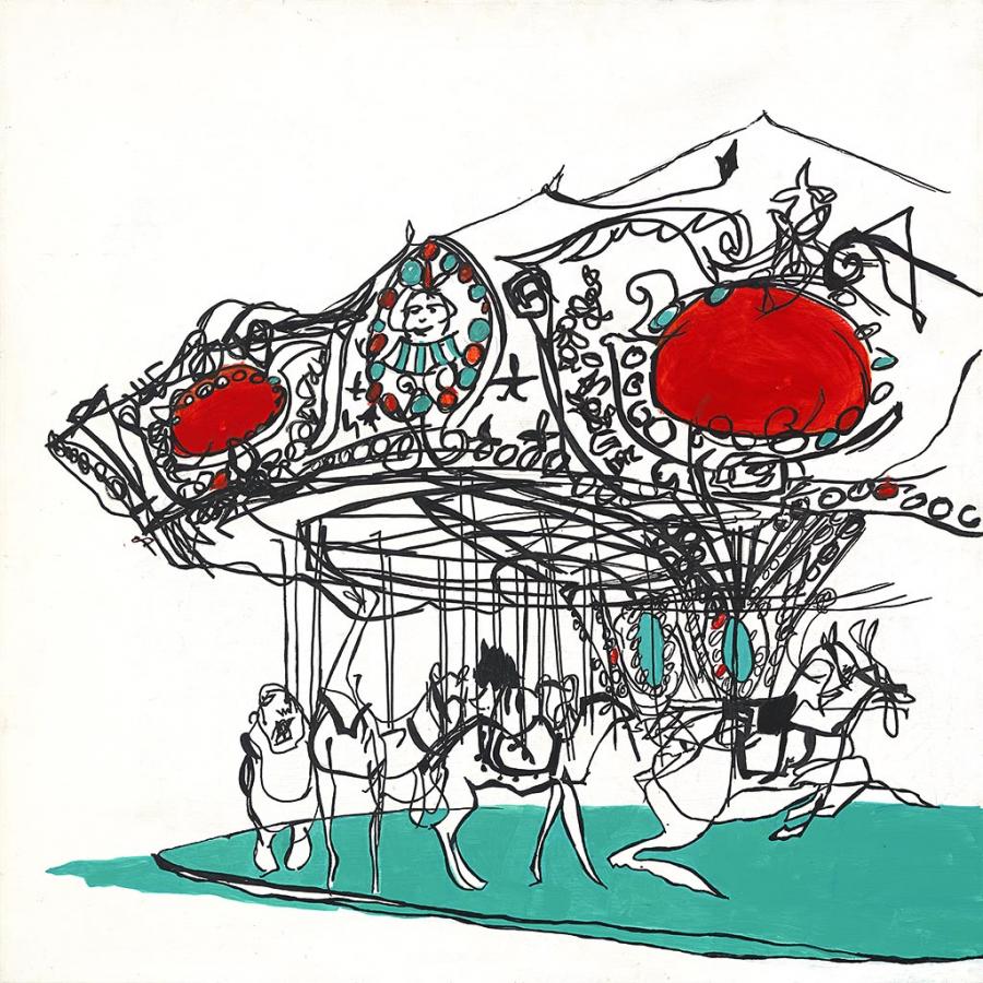 An illustrated image of a merry-go-round by Kayti Baur.