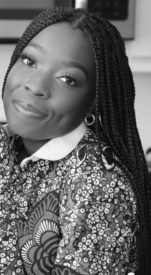 A black and white portrait of Oyinda Lagunju.