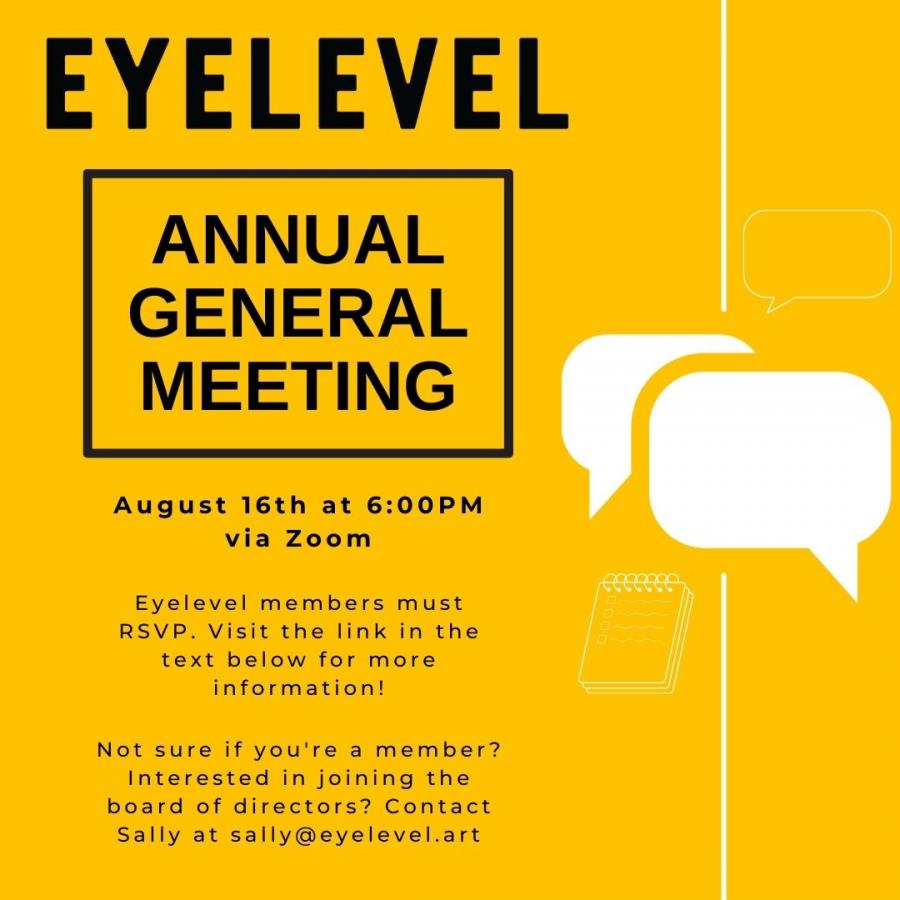 Calling all members of Eyelevel! Our Annual General Meeting (AGM) is happning on August 16th at 6:00PM over Zoom.