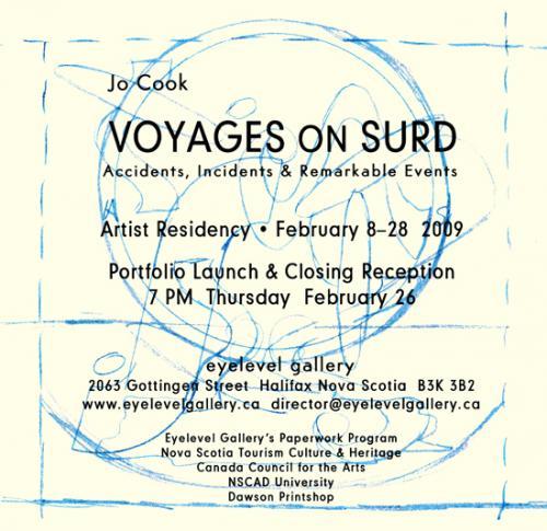 Artist Residency at Eyelevel Gallery in collaboration with the Dawson Printshop at NSCAD University Jo Cook is a visual artist, curator and publisher. She is the founder and CEO of Perro Verlag Books by Artists, http://www.perroverlag.com. Cook’s multiple personalities are frequent collaborators on one another’s projects. For the eyelevel residency, Voyages on Surd, Cook will be working with material being transmitted daily by the time-travellers, Emma Gideon-Koch, Malena Kirlianova, and Frances Zorn, participants in the 5th, 7th and 12th expeditions to the planet Surd.