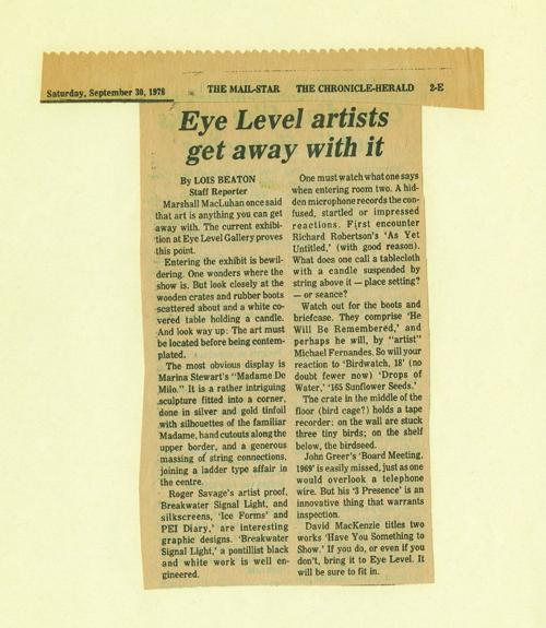 The Eye Level Gallery opens its autumn season tonight with a group exhibition. Work by gallery directors Michael Fernandes, John Greer, David MacKenzie, Richard Robertson, Roger Savage, and Marina Stewart are to be featured.