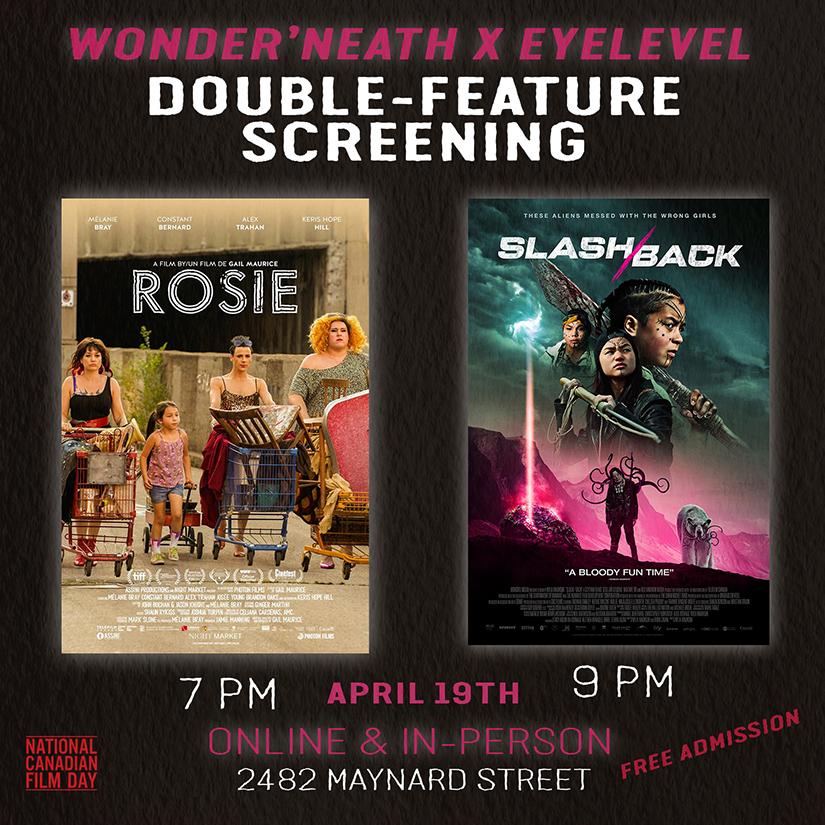 Join us in-person or online on Wednesday, April 19th for a double-feature screening presented by Wonder’neath and Eyelevel as part of National Canadian Film Day. We will be screening two feature-length films, Rosie and Slash/Back.