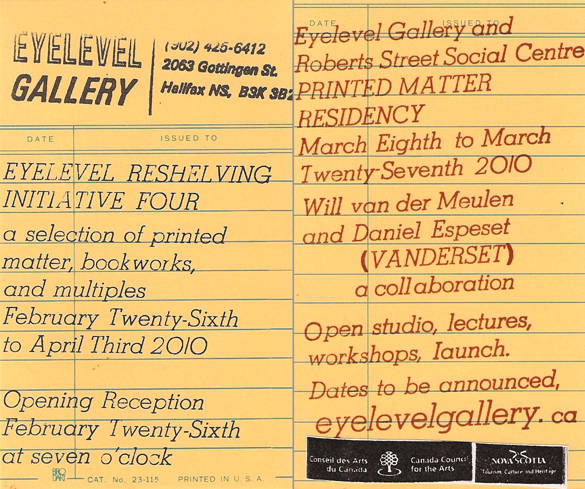 The Eyelevel Re-shelving Initiative is an international biennial exhibition of artist books, multiples, and printed matter, refreshing Eyelevel Gallery’s Bookstore collection with works from close to 80 established and emerging artists. This fourth installment offers a chance to peruse and purchase new and unusual works from: Red Fox Press (Ireland), Perro Verlag (Mayne Island, BC), Instant Coffee (Toronto), Islands Fold (Victoria), Valerie Salez (Halifax), Anteism Publishing (Victoria), Garity Chapman (Halifax), Andrew McLaren (Halifax), Adam O’Reilly (Halifax), T.R. Ericsson (New York), Stacy Ho (Toronto), and Dustin Wilson (Montreal) and many more.