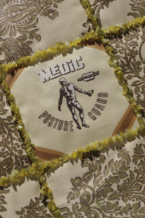 Tensions arise because while these embellished fragments are extremely attractive for their decorative qualities they are at the same time repellent when we consider that they are made from the fabric of discarded mattresses that strangers have slept on, had sex on and perhaps even died on; this is compounded when the fragments are sewn together in a quilt, an object meant to cover the body and provide comfort. It is this relationship to and engagement of the body that drives the tension in the work.