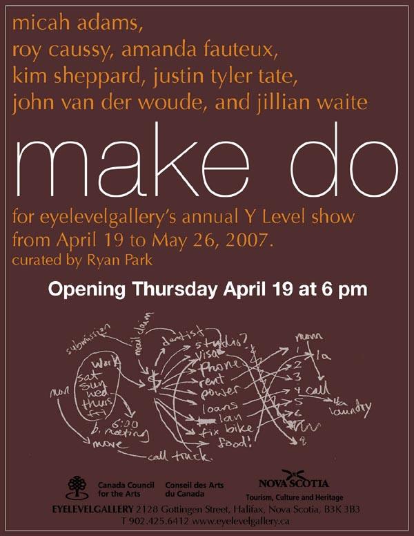 Make do, Eyelevel Gallery's 2007 Y Level exhibition of emerging Atlantic artists, presents the work of seven recent graduates that addresses and reflects on these limitations. Working from bedroom studios, materials at hand, and resourcefulness, the artists are able give form to their ideas and experiences: demonstrating possibilities of inquiry and practice as well as insistence on creative engagement with their circumstances and the world at large.