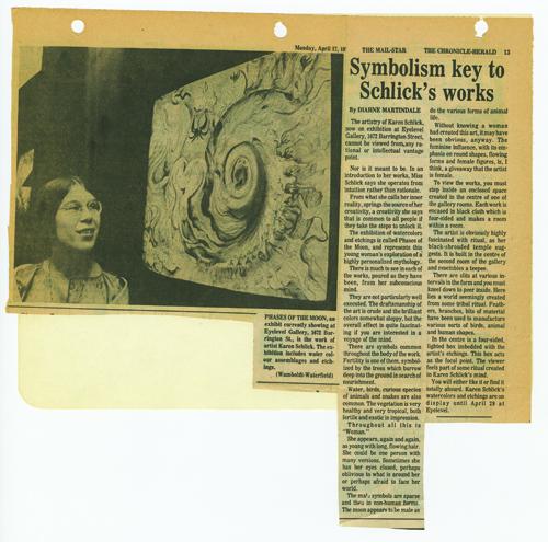 A multi-media exhibition of etchings, writing, watercolours, and shamanistic assemblages set in environments especially constructed to involve the viewer in the personal mythology of the artist.