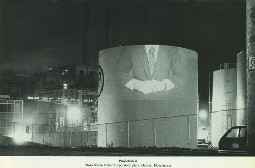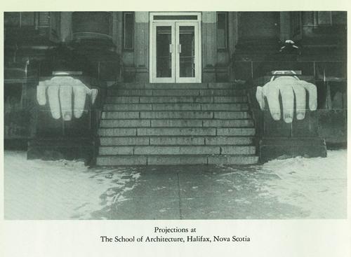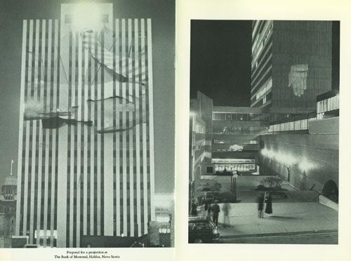 Each slide projection is specifically designed for a selected public building and is concerned with the institutional content of its architecture.