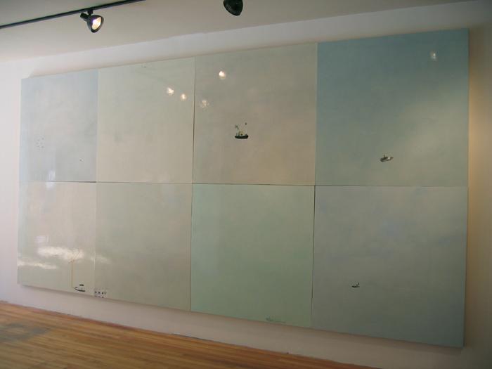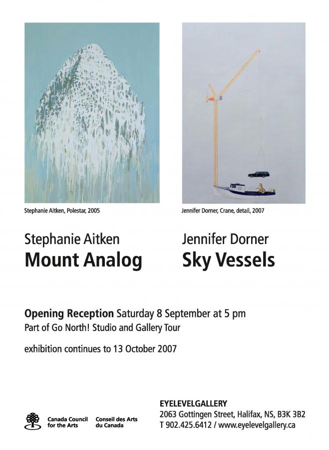 This two person exhibition features new paintings by Montreal-based artist Jennifer Dorner and Vancouver-based artist Stephanie Aitken. Jennifer Dorner's work, Sky Vessels, is influenced by a variety of mediums, social spaces, and everyday life. Key concepts include artifice and display and how these can create atmospheric space within painting. As a juncture, the small and detailed representation of leisure activity combined with transport vehicles acts as the catalyst for disrupting the painting field. The use of humour - the uncanny - within the pictorial narrative introduces a subtle, but complex compositional language. In this series of paintings, Dorner is building an artificial sky, panel by panel with miniscule elements that highlight the bizarre attributes of leisure activities emblematic of western culture.