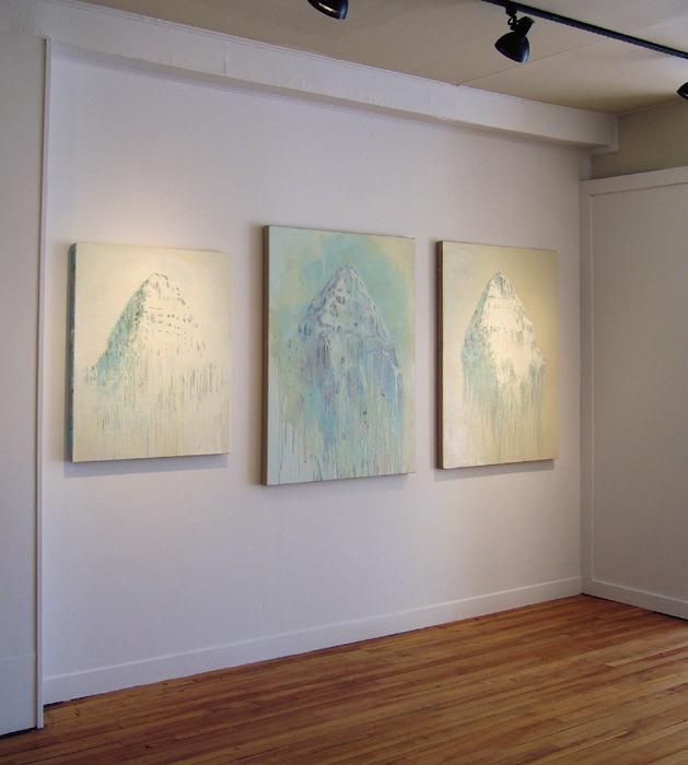 Stephanie Aitken's Mount Analog, is a series of recent paintings created on raw linen. These paintings are of mountains referencing the sublime of romantic landscape painting while challenging pictorial illusion. Often using dripping and a viscous application of paint and medium, Aitken explores the unstable physicality of the mountains and reflects on the current and possibly well-founded, anxiety about potential catastrophic events, an insecurity reminiscent of Ruskin and the late romantics and their projections onto the landscape of anxieties about God’s apocalyptic intentions. Maintaining qualities of their source images, mainly scenic photographs, Aitken is interested in the subjective criteria employed in the selection of events and phenomenon as subjects.