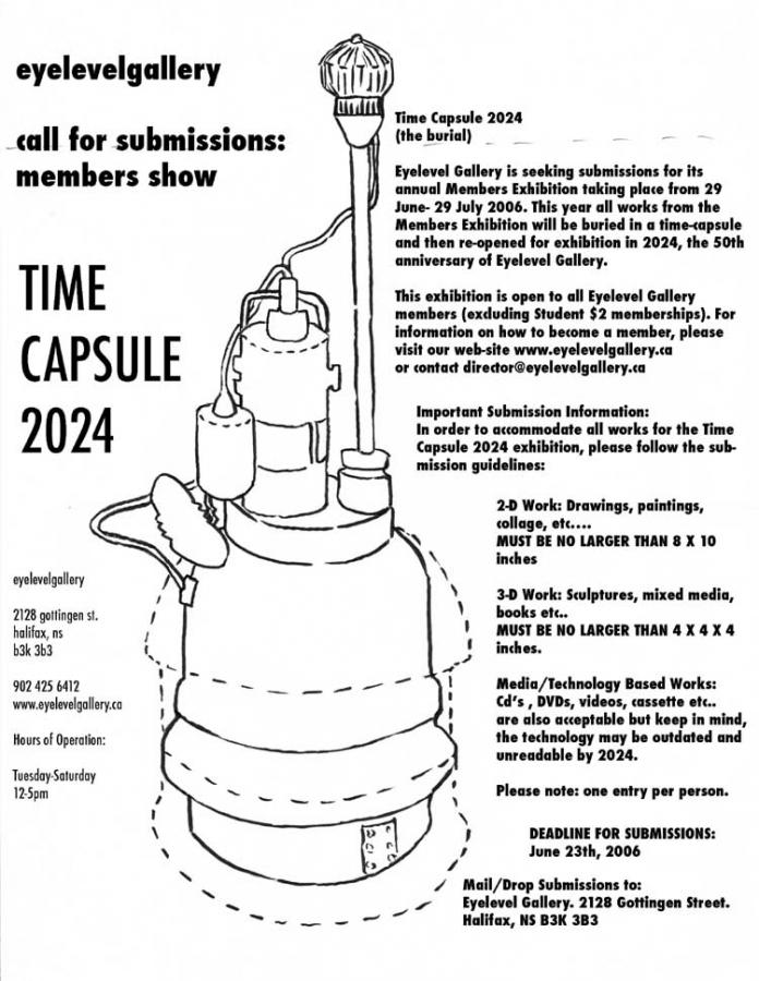 Eyelevelgallery has a reputation for seeking out and promoting contemporary art and artists. Its members live in Halifax and across the country, consisting of both well established names and new emerging voices. These are the artists that have been invited to contribute to this collective show. Submissions will be accepted up until the final day. On July 29th, following appropriate celebrations, the time capsule will be closed and hidden away until 2024.