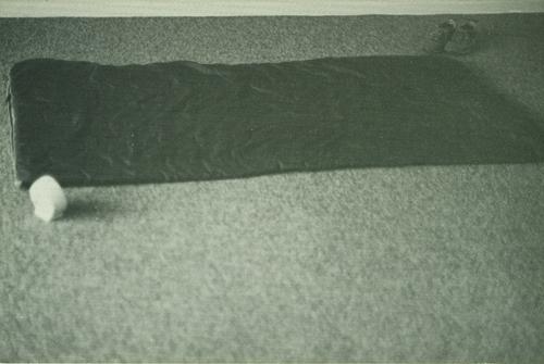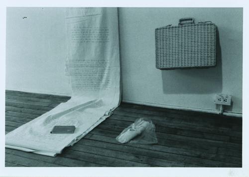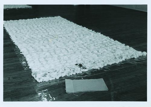 May speaks. Daily living is art, a truly realistic view. Audience participation is an integral part of my work. By reading the scrolls, or the cotton-pads, kneeling down, the audience completes the work. The work in two small rooms are done this year. The scrolls in the big room were done in 1979. The audience is encouraged to pick up the work – cotton pads, or smooth out scrolls – to read. Have fun