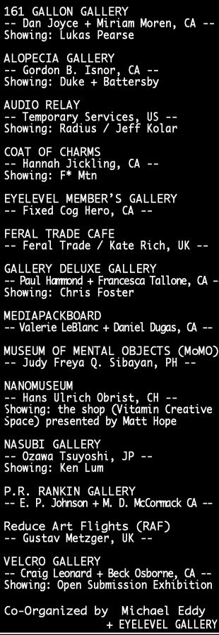 The World Portable Gallery Convention 2012 is an international convention on portable galleries and alternative spaces hosted by Eyelevel Gallery during the month of September. The project celebrates the variety of spaces with which curators around the globe have extended public interaction with art institutions.