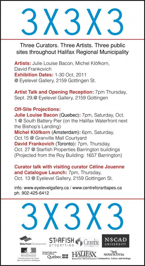 Eyelevel Gallery and the Centre For Art Tapes host Céline Jouenne, Directing Manager of Videospread (Marseilles, France) in a month-long program entitled 3X3X3, bringing together three curators, three artists and three public sites throughout Halifax Regional Municipality. All three curators will be working with artists who explore the degradation, juxtaposition, or technical implications of the moving image, set in relation to the photographic image. Over the month of October,