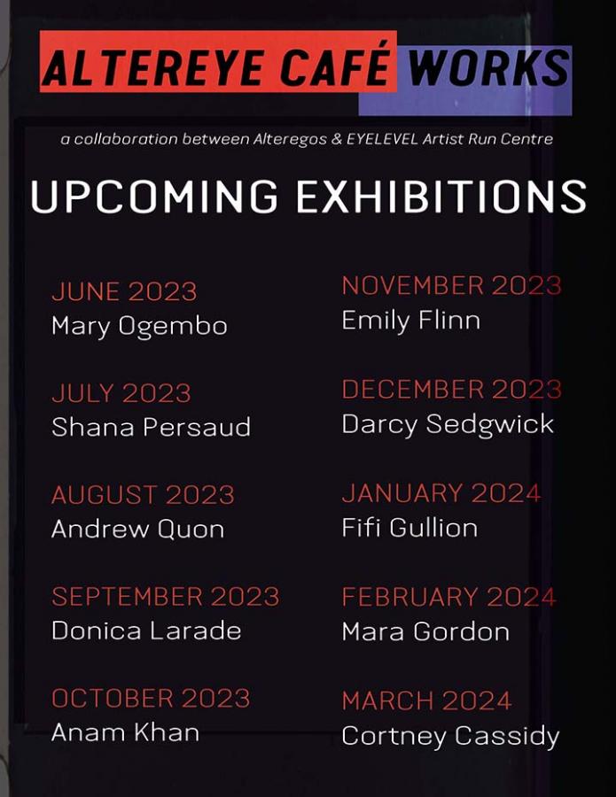AlterEye Café Works is a collaborative project between EYELEVEL and Alteregos Café that will run from June 2023 to March 2024. For the next ten months, 10 different local artists will exhibit their work out of the café. Pop by, grab a coffee from our favourite baristas, and take a look at some incredible art!