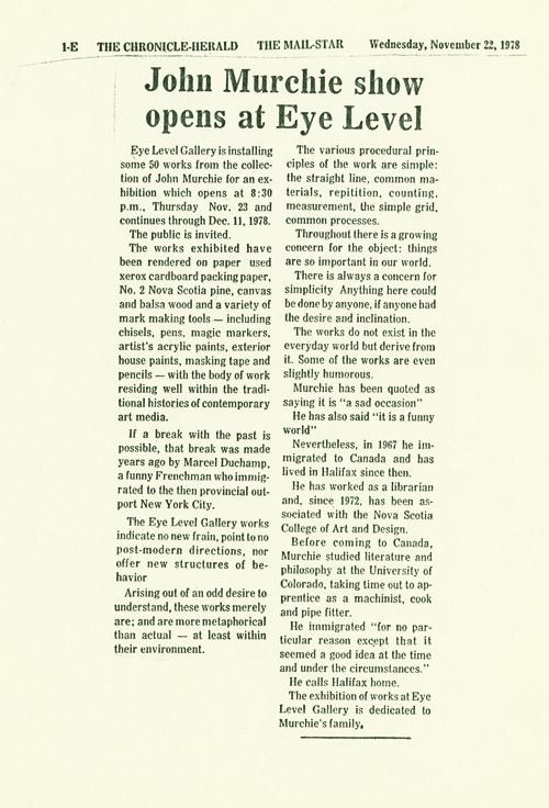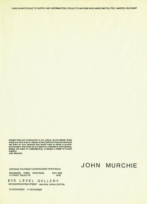 “I don’t know much about paint, painting. I do know you don’t need to know much; to make some art. Straight lines are fundamental to our culture, as are objects: these works are objects of paint defined simply as mere lines. Call them art only because they would make no sense in another environment. They arise out of a compelling desire to understand. And meaning, always the basis of understanding, is always a matter of human creation.” Murchie