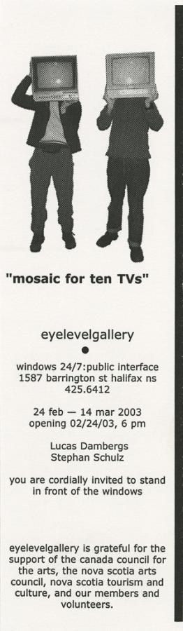 mosaic for ten TVs was an interactive video installation which confronted pedestrians walking by the gallery with a fragmented image of their own body. Five TV screens will be installed in each window of the gallery. As pedestrians walked by the windows, their images appeared on these screens, fragmented into parts. Stephan and Lucas used the power of the fragmented image in a way that exposes manipulation instead of hiding it.