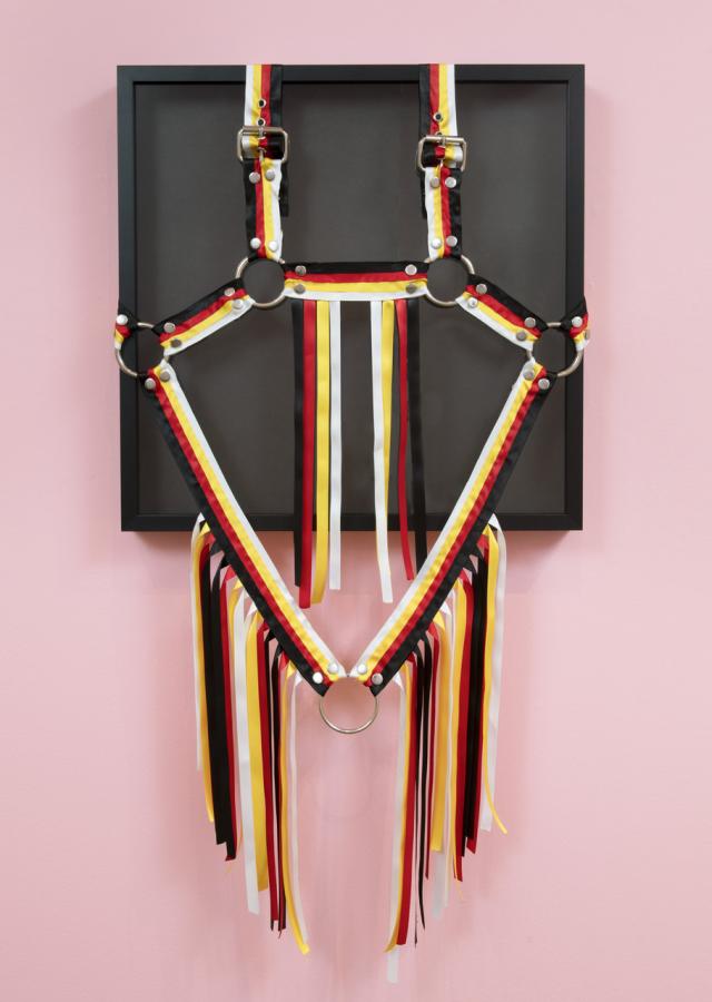 MOVEMAROW is a project in response to Brandon Hoax' latest work displayed in the 2019 Exhibition Worn Inward. Hoax will continue the exploration of the ribbon/regalia harness. The initial piece was about movement, the body, sex, ceremony, fetish, and self adornment, MOVEMARROW* will pick up where the original left off, which was static and displayed on the wall, Hoax will be making and reinforcing the harnesses so they become wearable by people. Throughout the project Hoax will contact artists/performers/contemporaries and create a custom harness for them, and then gift the harness to them. The gift is an open proposition, no pressure for a response, the gifted art object now belongs to the recipient, but Hoax is hoping artists and people who are given a harness will respond to them in a creative capacity, writing, photography, video, painting, selfie, performance.