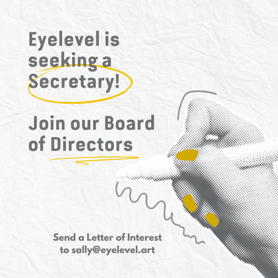 If you are interested in joining Eyelevel's board, please send a letter of intent outlining your experience and why you want to join our board (doesn't have to be long, and in the body of an email is perfectly fine!) to sally@eyelevel.art
