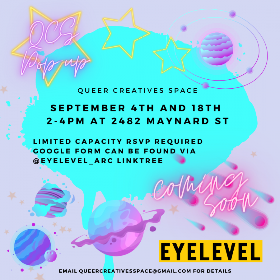 ID: A lavender background covered in bright turquoise paint splotches. In the top left corner, neon pink text reads QCS Pop-up, framed by a neon star. In the top right corner, a pink and turquoise planet sits, two rings with smaller pink planets orbiting it. In the center, over a large amount of turquoise paint, black text reads “Queer Creatives Space September 4th and 18th 2-4pm at 2482 Maynard St Limited Capacity RSVP REQUIRED Google Form can be found via Eyelevel’s linktree @eyelevel_arc” . In the bottom left corner, three pink, purple and blue planets sit. In the bottom right corner, “coming soon” reads in neon pink text, the black and yellow Eyelevel logo sitting underneath.